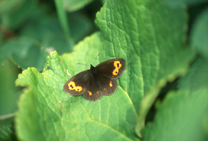 オレンジ色の帯が鮮やかな、北方系のジャノメチョウ。