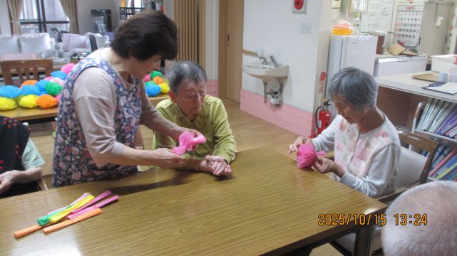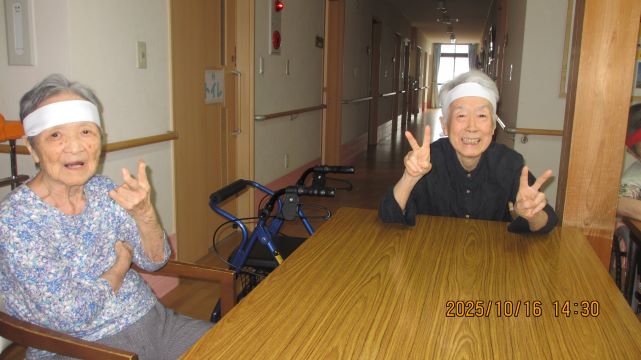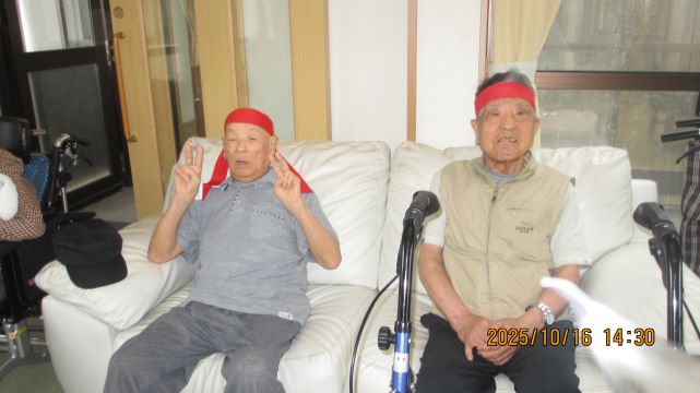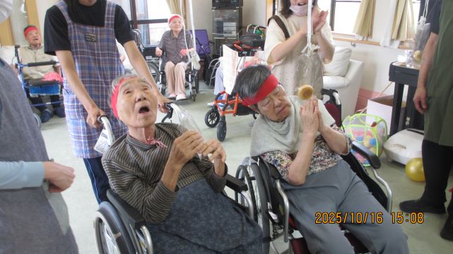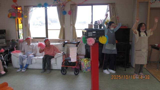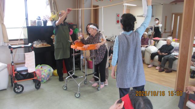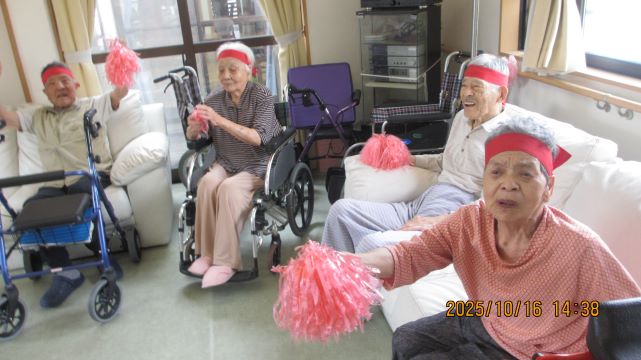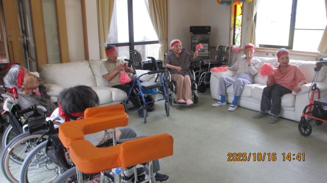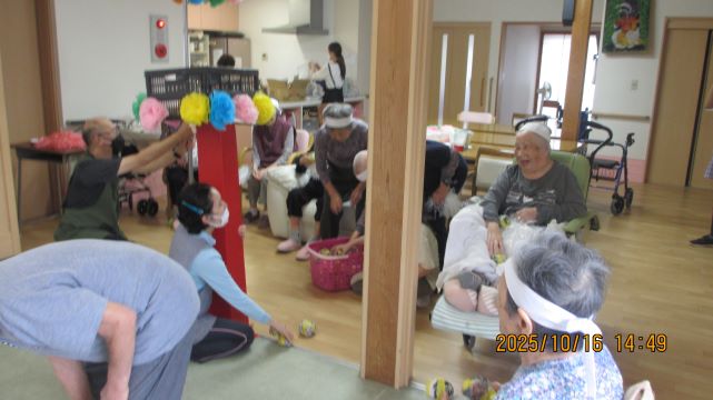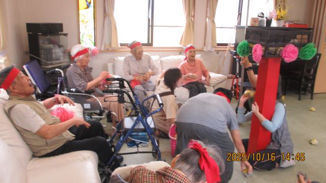 | 1、2号館 赤・白に分かれて運動会を行いました。 応援合戦、玉入れ、パン食い競争などを行い 楽しいひと時を共有しました。 |